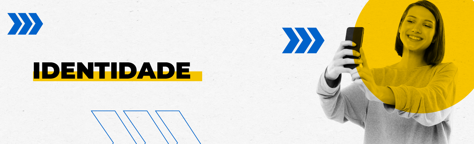 Fundo branco com duas setas azuis apontadas para o lado direito e com três retângulos na vertical. Tem uma mulher sorrindo com um celular na mão e com a câmera do celular apontada para o rosto, ela está vestindo um casaco leve cinza. Tem um círculo transparente amarelado por cima do rosto da mulher. Texto: Identidade.