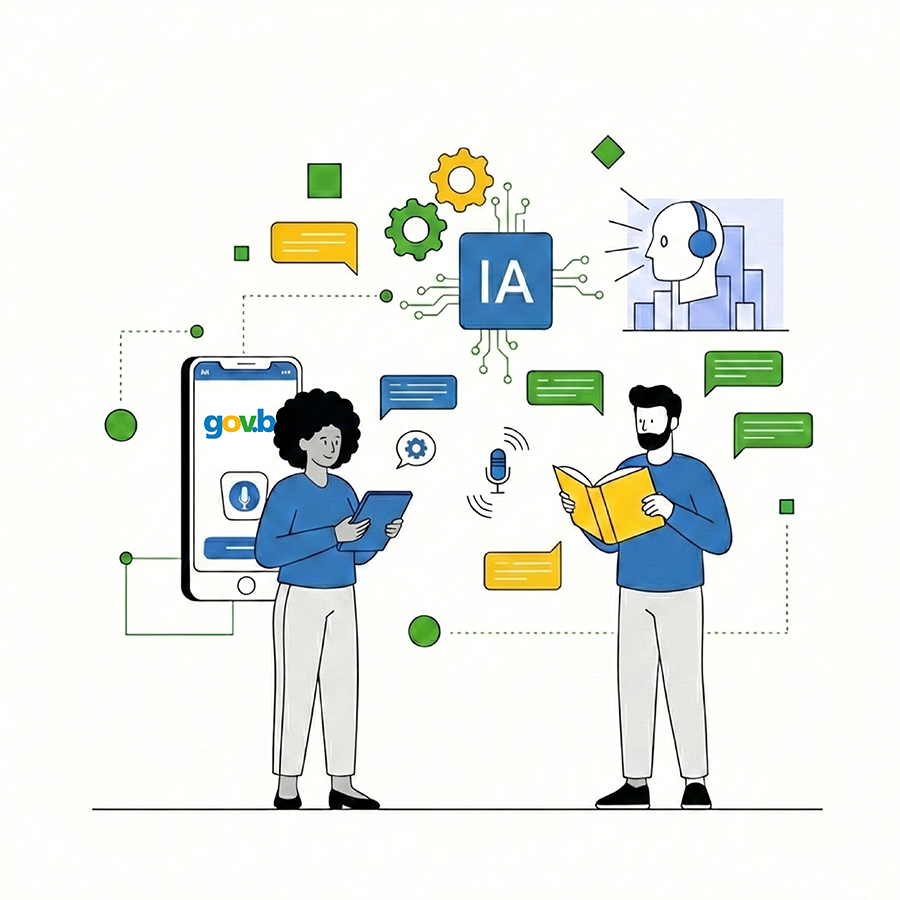 A ilustração representa um homem branco e uma mulher negra. O homem lê um livro e a mulher interage com um tablet. Ao redor vários elementos que fazem referência à inteligência artificial, como gráficos, engrenagens e conexões.
