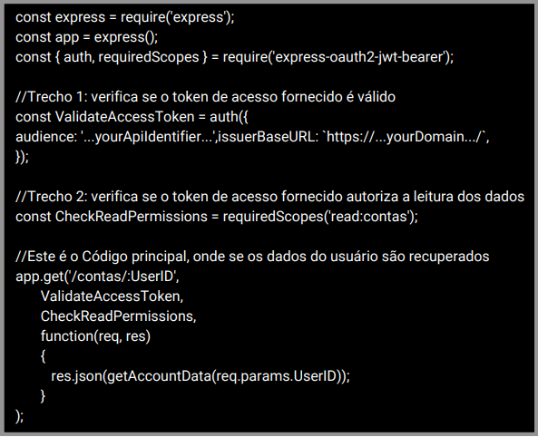 Este fragmento de código Node.js mostra como a requisição GET para /contas/:UserID é tratada. Perceba que o endpoint que tratará a UserID é protegido por dois middleware :