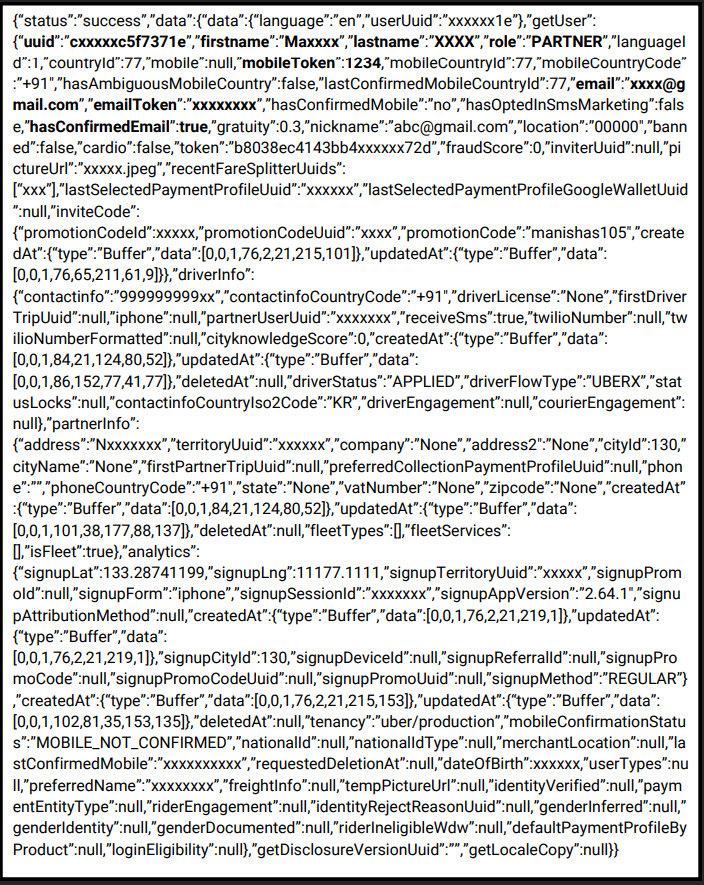 Tão logo o pesquisador conseguiu o vazamento de uma UUID Uber, ele foi capaz de usar essa UUID em uma chamada de API vulnerável para obter acesso às informações privadas da vítima.