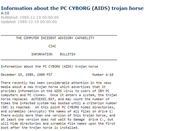 Embora fosse um malware bastante básico, foi a primeira vez que muitas pessoas ouviram falar do conceito - ou de extorsão digital. Não está claro se alguma pessoa ou organização pagou o resgate, mas é certo que o incidente causou enormes danos à época, com diversos pesquisadores perdendo todo o trabalho armazenado nos computadores afetados.