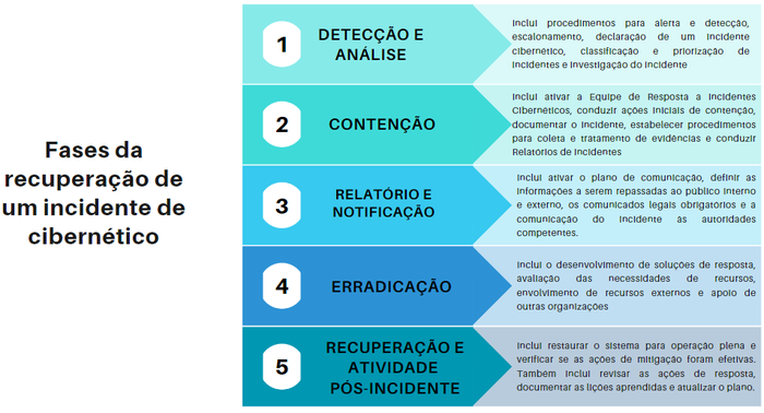 - Monitoramento do ambiente recuperado, a ser executado num período após o incidente cibernético, de forma a verificar comportamentos atípicos ou anormalidade nas operações.