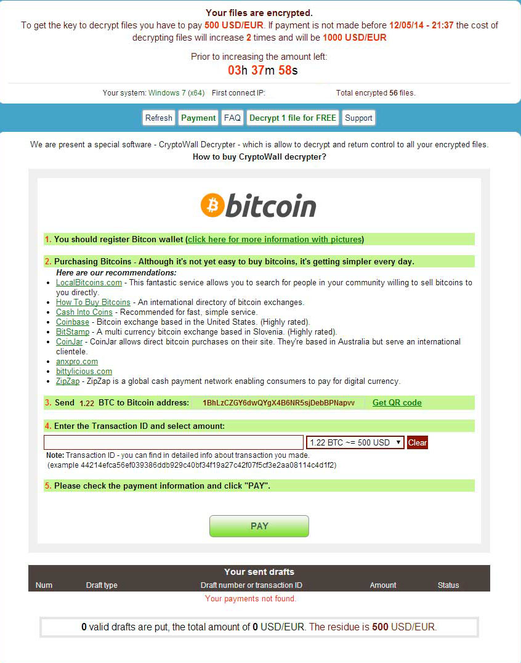 Página do grupo CryptoWall 4 fornece instruções a uma vítima dos procedimentos para a aquisição de bitcoins para o pagamento de resgates e do tempo restante para a realização do pagamento (fonte da imagem https://www.bleepingcomputer.com/news/security/cryptowall-4-0-released-with-new-features-such-as-encrypted-file-names/ )