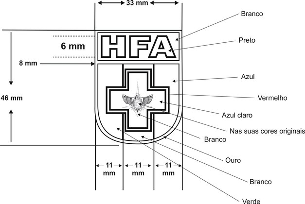 Descrição Heráldica: “Escudo peninsular português, mantelado em ponta e filetado de dourado. Chefe, de branco, contendo a sigla “HFA”, de preto, correspondente ao Hospital das Forças Armadas, Organização Militar de Saúde subordinada ao Ministério da Defesa. Campo carregado e terciado em pala, de verde, branco e azul ultramar, representativo das cores do Exército Brasileiro, da Marinha do Brasil e da Força Aérea Brasileira, respectivamente. Em contrachefe, o símbolo do HFA, composto por uma cruz, de vermelho, insígnia internacional de Saúde, alusiva à Cruz Vermelha Internacional, na caracterização das ações pias, de misericórdia e principalmente de Saúde, praticadas por esta benemérita Entidade, consentâneas com as missões do HFA, peça sobreposta, em primeiro plano, pelos símbolos concêntricos e unidos, das três Forças Singulares, em suas cores, representativos do público-alvo do nosocômio, sobre uma coluna estilizada, em forma de losango, de branco, da colunata do Palácio da Alvorada, símbolo do Distrito Federal e da arquitetura de Brasília, tudo em fundo azul celeste claro, na relembrança do céu da Capital Federal, onde se aquartela a Organização Militar”.