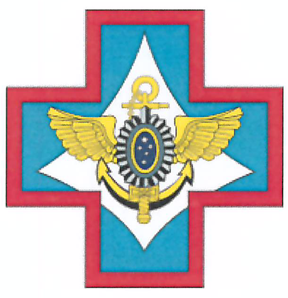 No elucidário temos: “o escudo em vermelho é o símbolo internacional de Saúde. A visão do primeiro plano, símbolo das três Forças Singulares, encimadas, representa a integração das Forças Armadas. No segundo plano, a tradicional coluna estilizada do Palácio da Alvorada, representando a integração nacional. Completa o símbolo o céu do Brasil”.