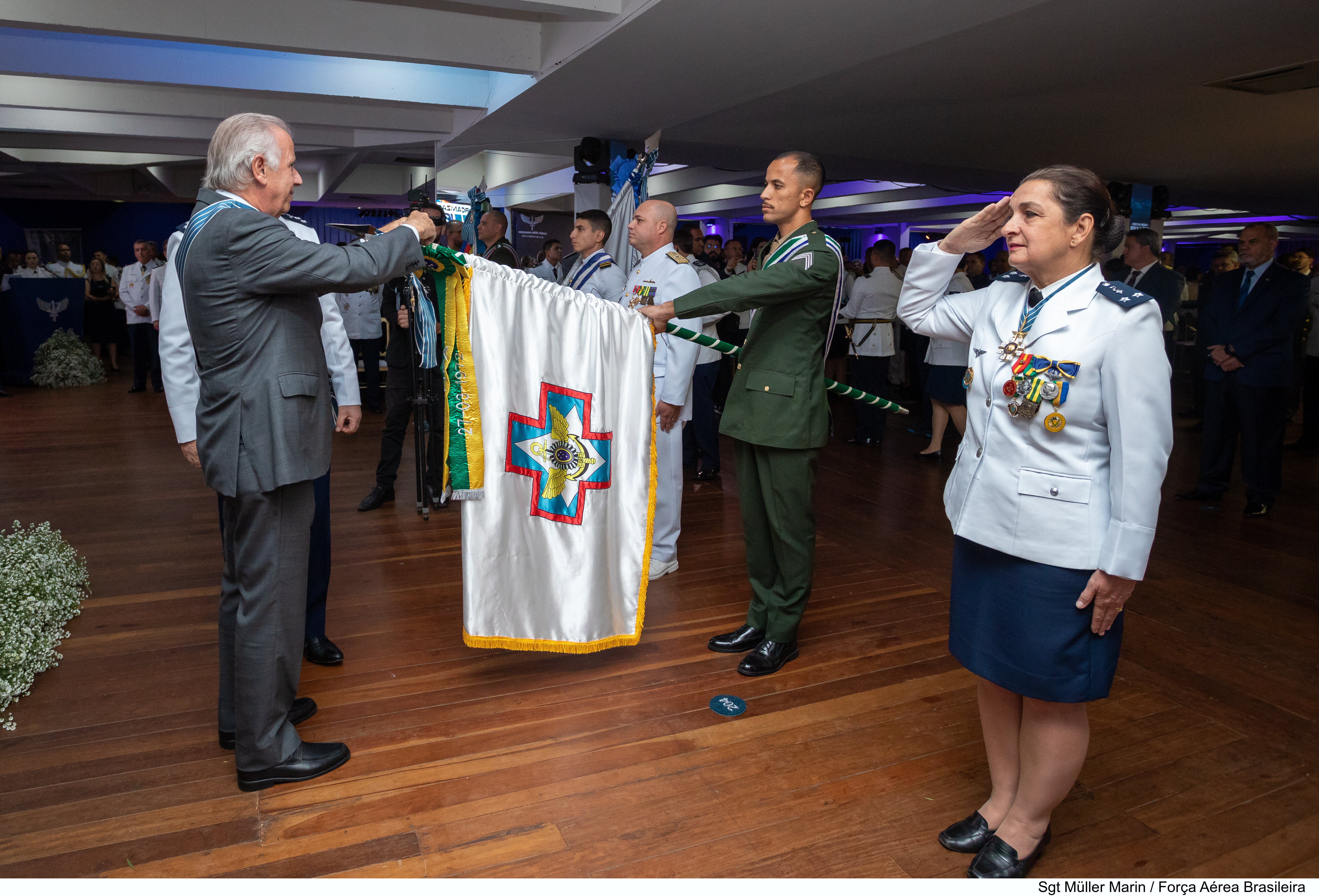 Brasília DF, 25/10/2023 – Na noite da última segunda-feira (23), o estandarte do Hospital das Forças Armadas foi condecorado com a imposição da insígnia da Ordem do Mérito Aeronáutico. A Solenidade ocorreu durante a cerimônia em Homenagem ao “Dia do Aviador e da Força Aérea Brasileira”, no Clube da Aeronáutica de Brasília.