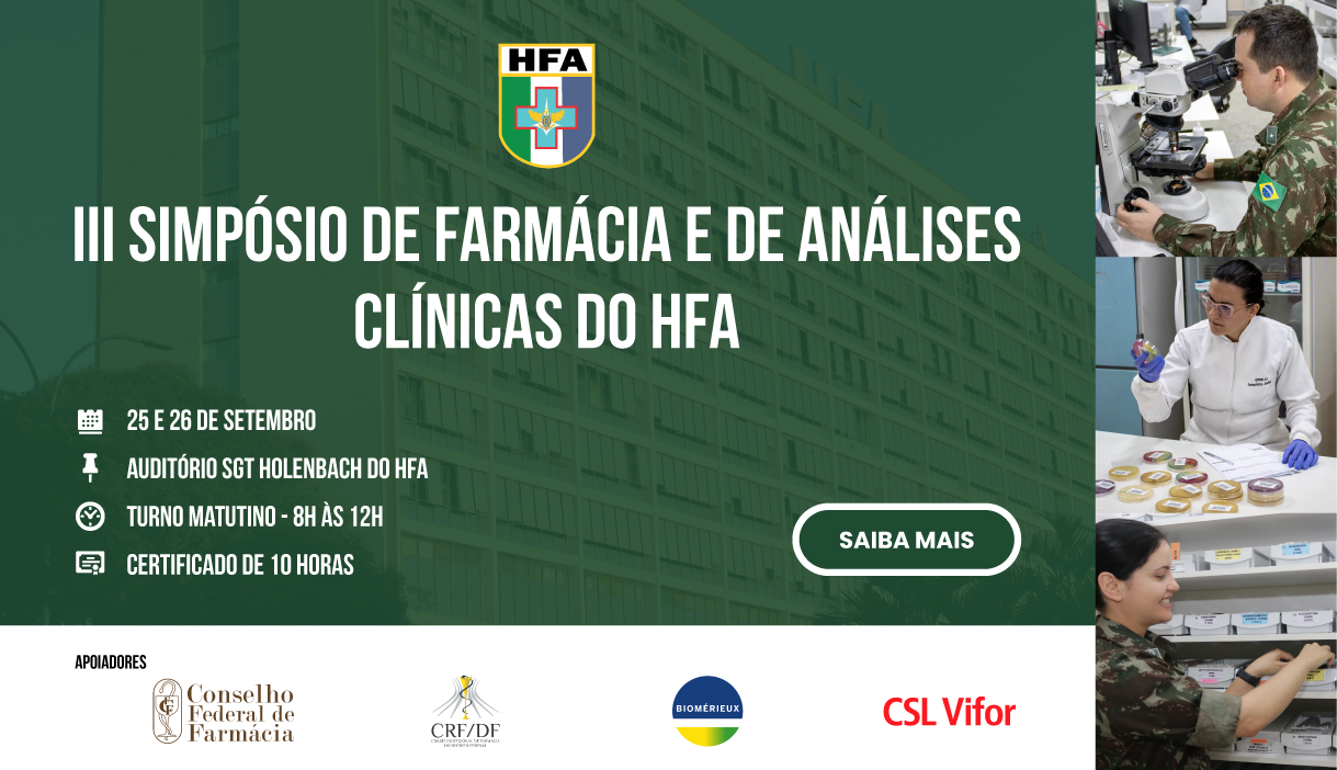 Notícias III Simpósio de Farmácia e de Análises Clínicas do HFA Compartilhe: Compartilhe por Facebook Compartilhe por Twitter Compartilhe por LinkedIn Compartilhe por WhatsApp link para Copiar para área de transferência Publicado em 04/09/2023 14h16 Atualizado em 04/09/2023 14h17