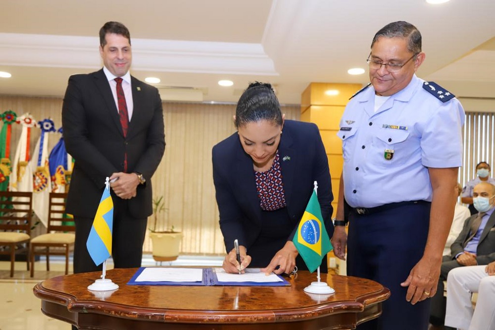 Brasília, 26/10/2021 - O Ministério da Defesa e a Câmara Brasileira de Comércio na Suécia (BrazilCham Sweden) assinaram hoje um Protocolo de Intenções, na sede do MD. O propósito da parceria, coordenada pela Secretaria de Produtos de Defesa (SEPROD), é estabelecer as diretrizes básicas para a organização e a implementação de iniciativas conjuntas relacionadas com pesquisa, desenvolvimento, promoção comercial, financiamentos, investimentos, seguros e garantias. A iniciativa é importantíssima para o fortalecimento da Base Industrial de Defesa brasileira (BID), que hoje representa 4,46% do PIB brasileiro, gerando 2,9 milhões de empregos diretos e indiretos.