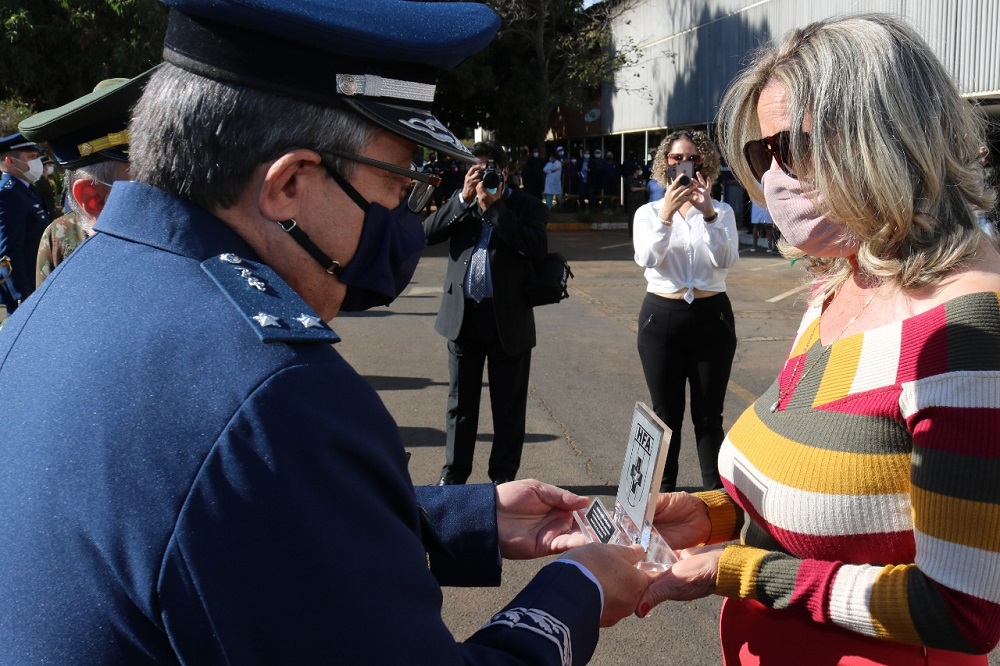 Em seguida, o General Canhaci, acompanhado do Brigadeiro Geraldo, entregou uma placa e a Referência Elogiosa à servidora, que estava visivelmente emocionada.