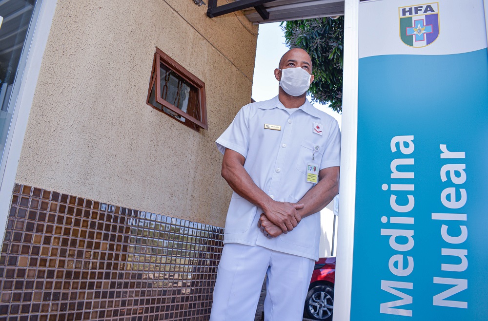 Trabalhando no HFA há 11 anos e na medicina nuclear, há 4, tendo ainda passado na medicina hiperbárica, o Suboficial Reginaldo Costa ressalta o trabalho da equipe e destaca o seu prazer em trabalhar com radioproteção e medicina nuclear. “É um mundo diferente. É uma experiência nobre que não tem em todos os hospitais”. “As pessoas as vezes vem com o sentimento de medo e podemos proporcionar, por meio do exame que realizamos, um norte diferente, não tem preço”. Destacou o marinheiro.