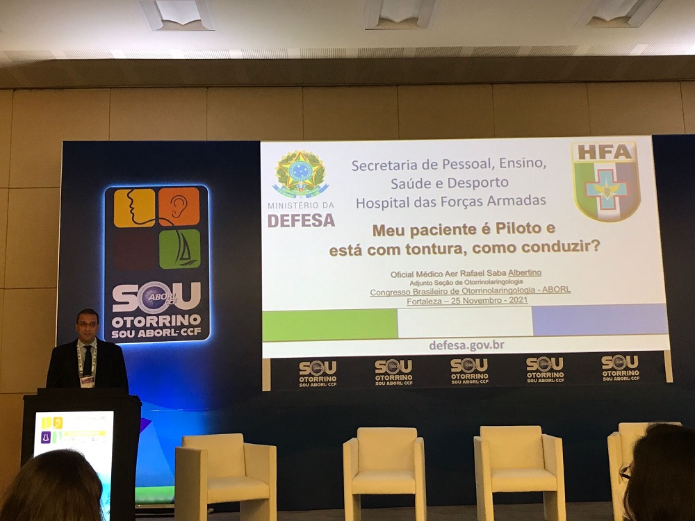 Brasília, 29/11/2021 – O Primeiro-Tenente médico, da Força Aérea Brasileira (FAB), Rafael Saba Albertino, médico da Seção de Otorrinolaringologia do Hospital das Forças Armadas (HFA), abrilhantou a 51ª edição do Congresso Brasileiro de Otorrinolaringologia por meio da realização de palestras sobre “tontura no piloto” e sobre “barotrauma”. Realizado no período de 25 e 27 de novembro, no Centro de Convenções do Ceará, na cidade de Fortaleza, no Estado do Ceará, o congresso apresentou uma programação científica cuidadosamente preparada para trazer as novas tendências da especialidade no âmbito mundial. O Evento contou a presença de médicos do Brasil e do exterior.