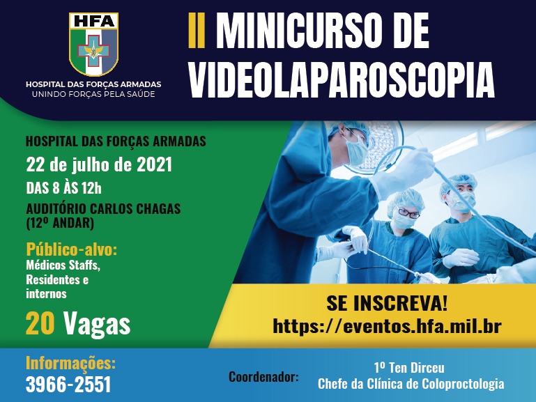 A Seção por meio do convênio entre o HFA e a UNICETREX Cursos Médicos, irá ministrar no dia 22 de julho um Curso de Videolaparoscopia no modelo de Minitreinamento de endossuturas em "Dry-Lab", os interessados poderão se inscrever no endereço https://eventos.hfa.mil.br