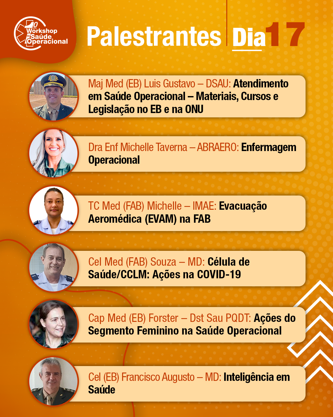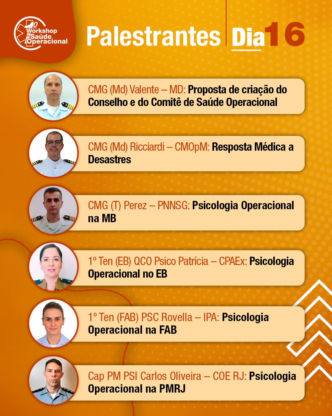 O encontro contará com a participação de especialistas no assunto das três Forças Singulares, bem como de instrutores externos. Serão abordados temas com ênfase na Psicologia Operacional, que tem crescido de significado e adquirido relevante papel nos últimos tempos, em operações no Brasil e no exterior.
