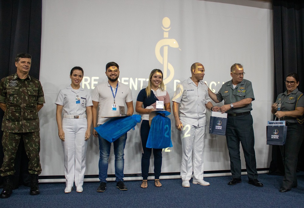 Os Doutores Pedro Guilherme Cabral e Taínne Gomes Lopes, 1º e 2º colocados, acompanhados de representantes dos supervisores de suas especializações médicas, receberam das mãos do General Fossi, do Contra Almirante Garcia e do Brigadeiro Braga as respectivas premiações e seus cumprimentos o que simboliza o empenho de toda a equipe de Residência Médica do HFA.