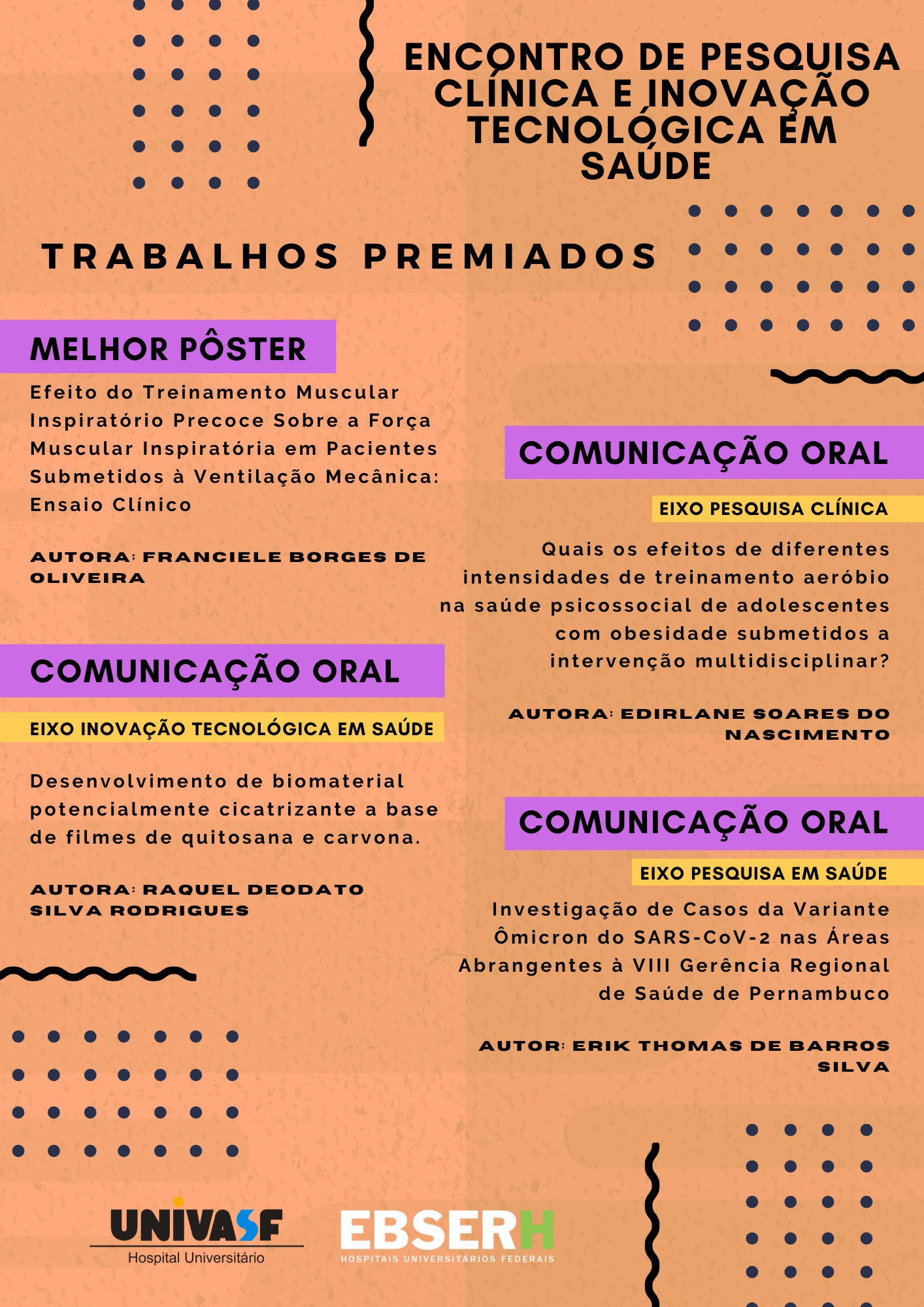 Petrolina (PE) – Após três dias de intensa troca de conhecimentos e experiências, o I Encontro de Pesquisa Clínica e Inovação Tecnológica em Saúde do Hospital Universitário da Universidade Federal do Vale do São Francisco, vinculado à Rede Ebserh (HU-Univasf/Ebserh), foi encerrado na última sexta-feira, 18, no auditório do HU, com o anúncio do Prêmio Destaque em Ciência e Saúde, destinado aos melhores trabalhos apresentados.