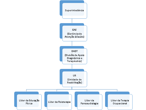 Para cada profissão existe um líder que hierarquicamente responde ao Chefe da Reabilitação (UR) e este ao Setor de Apoio Diagnóstico e Terapêutica (DADT) que também está submetido à Gerência de Atenção à Saúde (GAS) e finalmente à Superintendência como mostra o organograma abaixo: