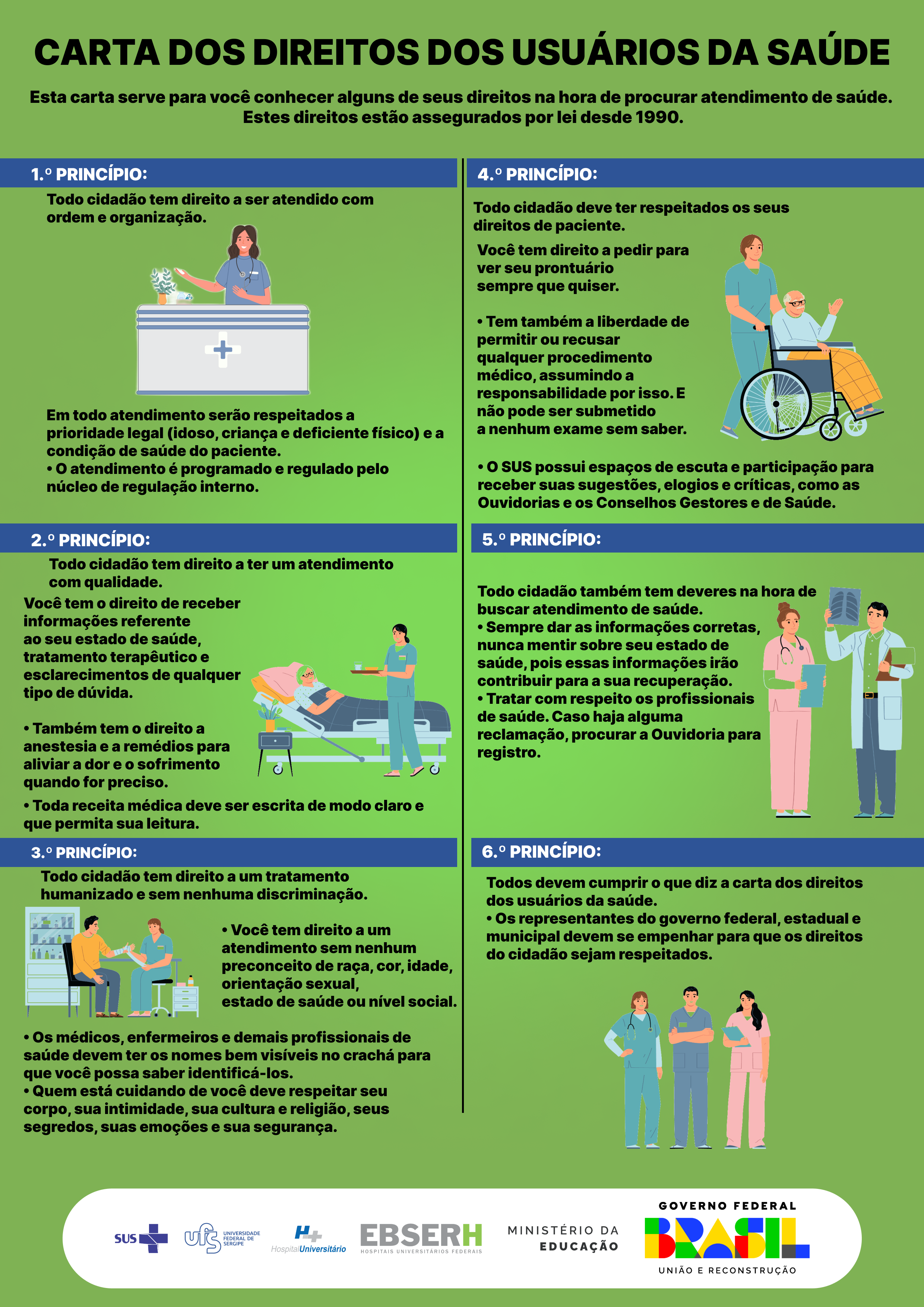 A Carta de direitos dos usuários do Sistema Único de Saúde (SUS) traz informações para que você conheça seus direitos na hora de procurar atendimento de saúde. Ela reúne os seis princípios básicos de cidadania que asseguram ao brasileiro o ingresso digno nos sistemas de saúde, seja ele público ou privado.