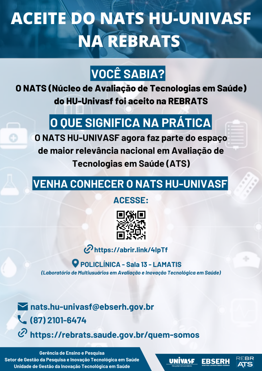 Com o intuito de atender as finalidades do NATS/HU-UNIVASF com relação à disseminação e fortalecimento de uma cultura de Avaliação de Tecnologias em Saúde (ATS) e à Prática em Saúde Baseada em Evidências para profissionais de saúde, gestores, residentes, alunos da graduação e pós-graduação do Hospital e comunidade em geral, estaremos disponibilizando informações sobre cursos disponíveis e notícias que versem sobre a temática.