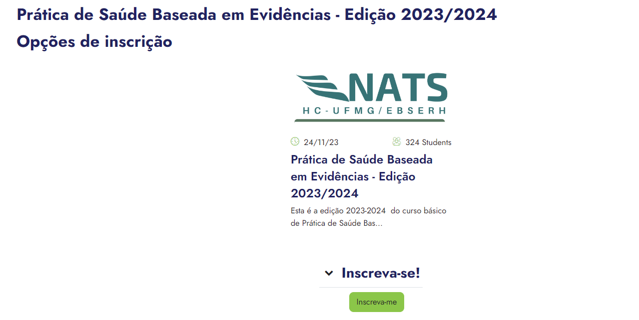Esta é a edição 2023-2024 do curso básico de Prática de Saúde Baseada em Evidências promovido pelo Núcleo de Avaliações de Tecnologias em Saúde (NATS) do HC-UFMG, como um projeto vinculado ao Cenex-HC/UFMG.