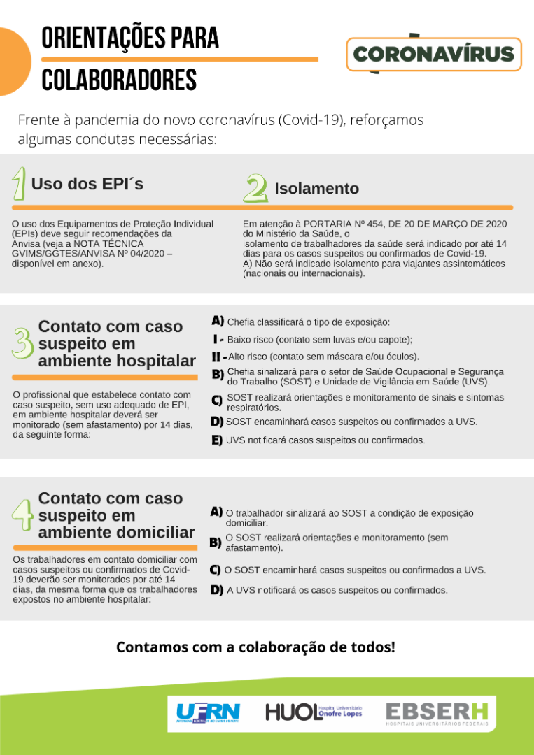 Navegue pelos conteúdos desta página e acompanhe as principais orientações e procedimentos para colaboradores do Hospital Universitário Onofre Lopes, vinculado à Universidade Federal do Rio Grande do Norte e à Rede Hospitalar Ebserh (Huol-UFRN/Ebserh).