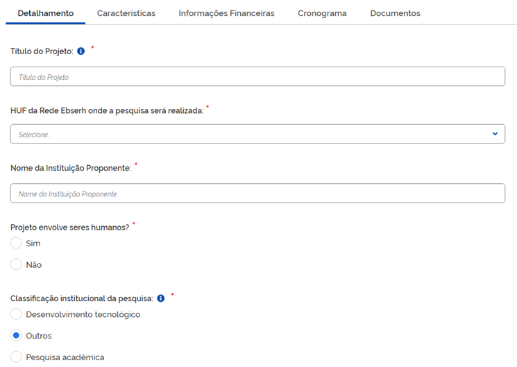 Na aba “Detalhamento”, o pesquisador fornecerá a informação em cada um dos campos obrigatórios. No campo “HUF da Rede Ebserh onde a pesquisa será realizada” (ver figura abaixo), o pesquisador escolherá a opção a opção “[HDT-UFT] Hospital de Doenças Tropicais da Universidade Federal do Tocantins”. Em “Nome da Instituição Proponente”, o pesquisador digitará o nome da instituição à qual está vinculado. Caso a pesquisa esteja relacionada a um programa de pós-graduação, a instituição proponente da pesquisa será aquela à qual o programa está vinculado. No campo “Projeto envolve seres humanos”, caso o pesquisador marque a opção “Sim”, a informação apresentada no campo “Título do projeto” deverá ser a mesma que aquela fornecida na Plataforma Brasil. No campo “Classificação institucional da pesquisa”, caso o estudo propõe desenvolver ou melhorar um processo ou produto, o pesquisador escolherá a opção “Desenvolvimento Tecnológico”.