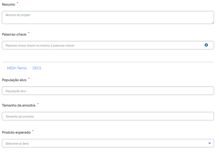 No campo “Palavras-chave” (ver figura abaixo), o pesquisador precisará inserir pelo menos três palavras. Para inserir uma palavra-chave, digitará a palavra no campo apropriado e clicará no símbolo “+”. No campo “População-alvo”, o pesquisador descreverá a população para a qual os resultados do estudo serão generalizados (Ex. Pacientes adultos com leishmaniose visceral).