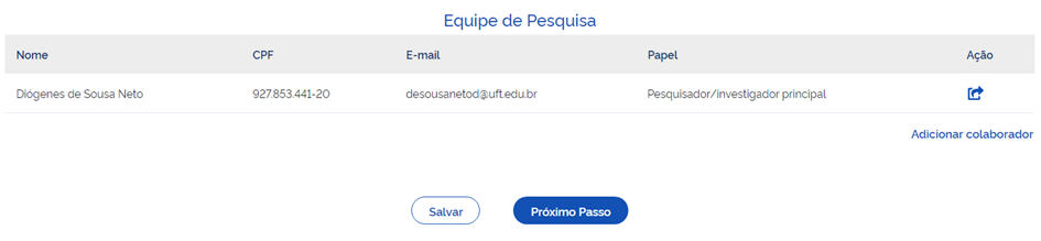 No campo “Equipe de Pesquisa” (ver figura abaixo), para adicionar um pesquisador à equipe de pesquisa, o mesmo também deverá estar credenciado no hospital. Caso o Pesquisador/investigador principal da pesquisa não tenha vínculo profissional com o HDT-UFT ou com a Ebserh, ao menos um membro da equipe de pesquisa deverá pertencer ao hospital, conforme previamente mencionado em Orientações gerais. Ao finalizar o preenchimento desta aba, o pesquisador clicará em “Salvar” e depois em “Próximo Passo”.
