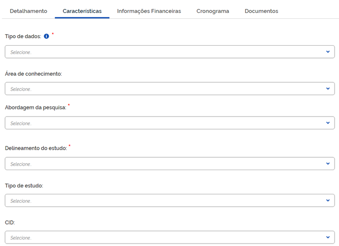Na aba “Características” (ver figura abaixo), no campo “Tipo de dados”, o pesquisador escolherá se o dado pretendido para o estudo será “Primário” ou “Secundário”. Dados primários são aqueles que não foram antes coletados, estando ainda em posse dos pesquisados, e que são coletados com o propósito de atender às necessidades específicas da pesquisa em andamento. Dados secundários são aqueles que já foram coletados, tabulados, ordenados e, às vezes, até analisados e que estão catalogados à disposição dos interessados (dados de prontuários e fichas de notificação, por exemplo). Em “Abordagem da pesquisa”, o pesquisador informará se a pesquisa é “Quantitativa”, “Qualitativa” ou “Quanti-qualitativa”. Caso a análise e interpretação dos dados da pesquisa sejam baseados em critérios estatísticos, o pesquisador escolherá a opção “Quantitativa”. Caso a interpretação e análise dos dados utilizem descrições e narrativas, o pesquisador escolherá a opção “Qualitativa”. O pesquisador escolherá a opção “Quanti-qualitativo” quando as duas abordagens forem empregadas no mesmo estudo. Em “Delineamento do estudo”, o pesquisador descreverá se o estudo é do tipo “Transversal”, “Coorte”, “Caso-controle”, “Estudo de caso” ou “Outros”. O tipo de delineamento do estudo dependerá do objetivo principal da pesquisa. Caso deseje, no campo “CID”, escolherá a classificação internacional da doença em estudo.