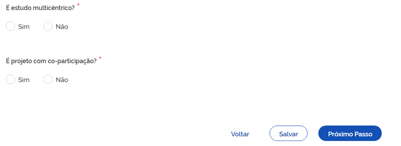 No campo “É um estudo multicêntrico?” (ver figura abaixo), o pesquisador marcará a opção “Sim” somente se as etapas previstas no projeto forem igualmente replicadas em outros hospitais e o HDT-UFT for o centro coordenador do estudo. Caso contrário, o pesquisador marcará a opção “Não”. No campo “É projeto com co-participação”, o pesquisador marcará a opção “Sim” caso o Pesquisador/investigador principal do estudo não tiver vínculo profissional com o HDT-UFT e apenas uma fase ou etapa da pesquisa for realizada na instituição. Neste caso, no campo “Outras instituições participantes” (ver figura abaixo), digitará “HDT-UFT”. Na situação em que o Pesquisador/investigador principal do estudo tiver vínculo profissional com o HDT-UFT e alguma fase/etapa da pesquisa for realizada em outra instituição, o mesmo também marcará a opção “Sim” e informará o nome da instituição no campo “Outras instituições participantes”. Caso contrário, marcará a opção “Não”. Ao finalizar o preenchimento desta aba, o pesquisador clicará em “Salvar” e depois em “Próximo Passo”.