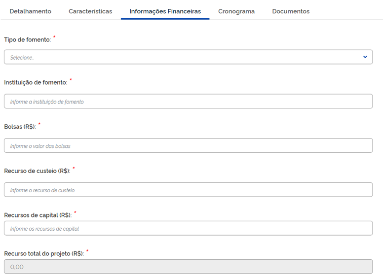 Na aba “Informações Financeiras”, no campo “Tipo de fomento” (ver figura abaixo), o pesquisador selecionará o tipo de financiamento obtido para a pesquisa e, em seguida, no campo “Instituição de fomento”, informará o nome da instituição patrocinadora do estudo. Caso escolha a opção “Próprio pesquisador” em “Tipo de fomento”, o campo “Instituição de fomento” será desabilitado. O pesquisador também deverá informar os valores relativos a “Bolsas”, “Recursos de custeio” e “Recursos de capital”. O “Recursos de custeio” refere-se aos investimentos aplicados ao patrimônio, tais como obras, construções, instalações e aquisição de equipamentos e materiais permanentes, enquanto os “Recursos de custeio” destina-se a cobrir despesas relacionadas aquisição de material de consumo (materiais de expediente, medicamentos, EPIs, etc.) e contratação de serviços (manutenção e calibração de equipamento, realização de exames, telefonia, etc.). Caso não haja despesas à serem informadas num destes três campos, o pesquisador informará o valor 0,00.