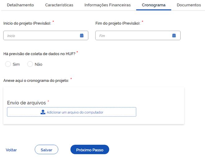 Na aba “Cronograma” (ver figura abaixo), no campo “Há previsão de coleta de dados no HUF?”, caso escolha a opção “Sim”, o pesquisador informará a data de “Início da coleta (Previsão)” e de “Fim da coleta (Previsão)”. No campo “Envio de arquivos”, o pesquisador anexará o cronograma de execução contendo cada uma das etapas do projeto, inclusive aquela relativa a submissão e análise da pesquisa pelo CEP (caso a pesquisa envolva a participação de seres humanos). Ao finalizar o preenchimento desta aba, o pesquisador clicará em “Salvar” e depois em “Próximo Passo”.