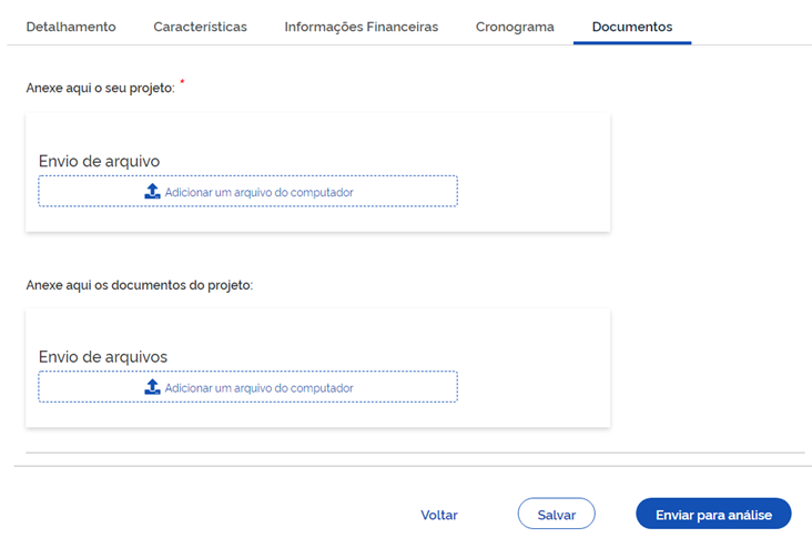 Na aba “Documentos” (ver figura abaixo), no campo “Anexe aqui o seu projeto”, o pesquisador anexará o projeto de pesquisa em formato PDF. Caso a pesquisa envolva seres humanos, recomenda-se a utilização do modelo de Projetos de Pesquisa disponibilizado pelo hospital. No campo “Anexe aqui os documentos do projeto”, o pesquisador anexará o Termo de Responsabilidade e o(s) anexo(s) do projeto (se existir). Ao finalizar o preenchimento desta aba, o pesquisador clicará em “Salvar” e depois em “Enviar para análise”.