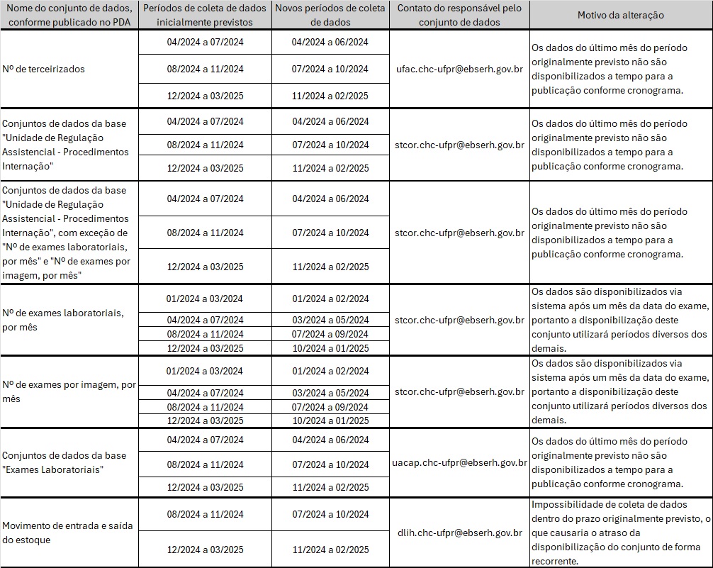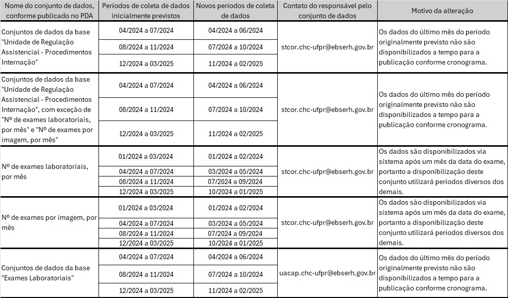 Nota explicativa que trata das mudanças dos períodos de coletas de dados nos conjuntos listados, conforme solicitação da área responsável.