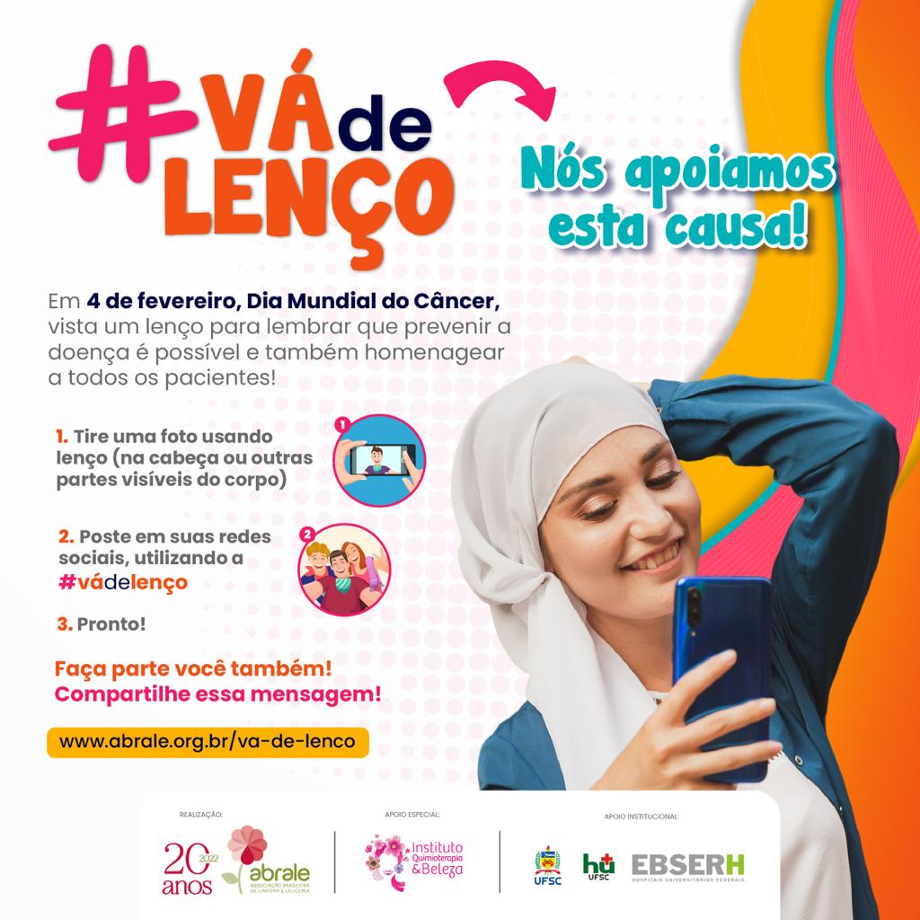 O dia 4 de Fevereiro é o Dia Mundial do Câncer e, nesta data, acontece a campanha Vá de Lenço, promovida todos os anos pela Associação Brasileira de Linfoma e Leucemia (Abrale) para alertar sobre a importância da prevenção por meio dos hábitos saudáveis e também homenagear os pacientes oncológicos em tratamento e aqueles que estão em remissão ou curados.