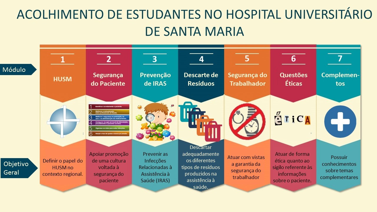 O curso tem o objetivo de fornecer informações aos estudantes sobre temas relacionados às boas práticas para promoção da segurança do paciente e do trabalhador, nas suas atividades relacionadas a disciplinas, estágios e participação em projetos a serem desenvolvidos no HUSM. Este curso é fruto de uma parceria entre a Gerência de Ensino e Pesquisa, Núcleo de Educação Permanente em Saúde e Setor de Vigilância em Saúde e Segurança do Paciente.