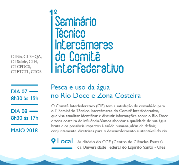 O Comitê Interfederativo (CIF), composto por cerca de 70 instituições federais, estaduais e municipais, realizará o Seminário "Pesca e uso da água no Rio Doce", para atualizar informações e identificar os desafios da atividade pesqueira no Rio Doce e zona costeira de influência, definir as diretrizes para seu desenvolvimento sustentável e atualização acerca das informações sobre qualidade da água bruta do Rio Doce e foz e os potenciais impactos à saúde humana. Datas e horários: • 07/05/2018 de 8h30 às 19h00 Local: Auditório do CCE (Centro de Ciências Exatas) da Universidade Federal do Espírito Santo (Ufes) |