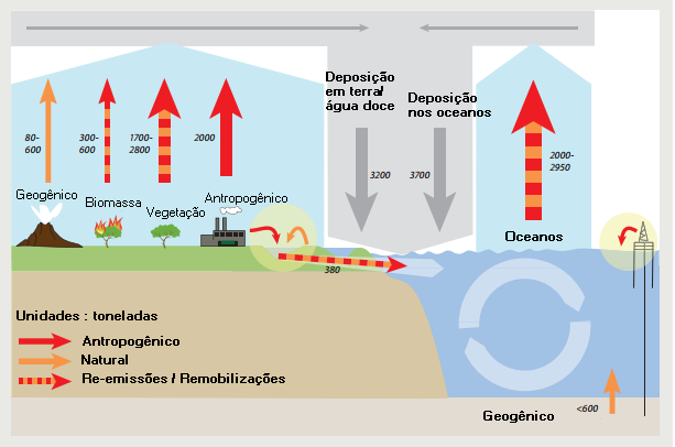 Valores do relatório global de avaliação de emissões, considerando-se fontes antropogênicas e geocênicas, publicados pelo Programa das Nações Unidas para o Meio Ambiente (PNUMA) em 2013. http://www.unpe.org/PDF/PressRelease/GlobalMercury/Assessment2013.pdf
