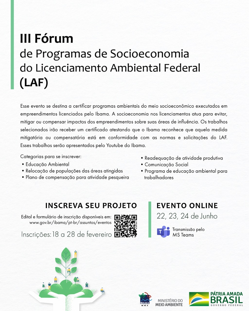 Brasília (18/02/2021) - O Fórum de Programas de Socioeconomia no Licenciamento Ambiental Federal (LAF) chega a sua terceira edição em 2021. Promovido pelo Ibama, o evento receberá, até 02 de março, inscrições de empresas de consultoria e empreendedores interessados no reconhecimento e certificação quanto a qualidade dos programas ou projetos de socioeconomia executados dentro do LAF.