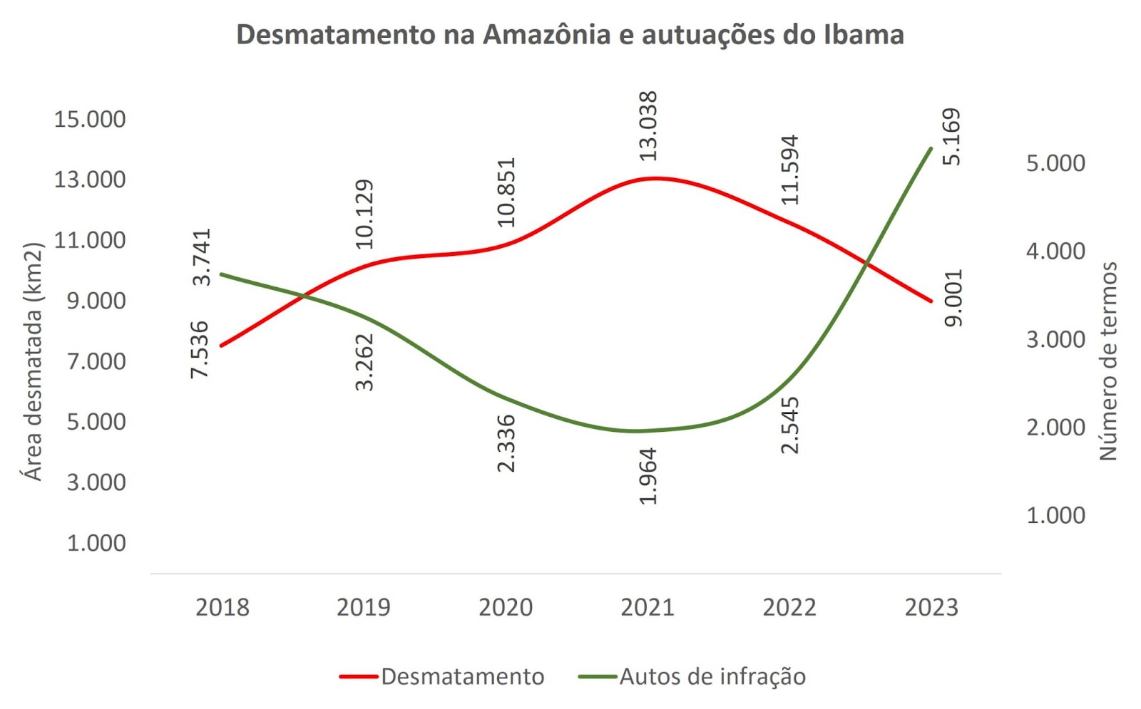 A queda de 22,3% do desmatamento na Amazônia registrada pelo Prodes é resultado da intensificação das ações de comando e controle, com destaque para o aumento, no mesmo período, de 104% dos autos de infração aplicados pelo Ibama por infrações contra a flora na Amazônia. Já as apreensões aumentaram 61%, os embargos, 31%, e a destruição de equipamentos, 41%.
