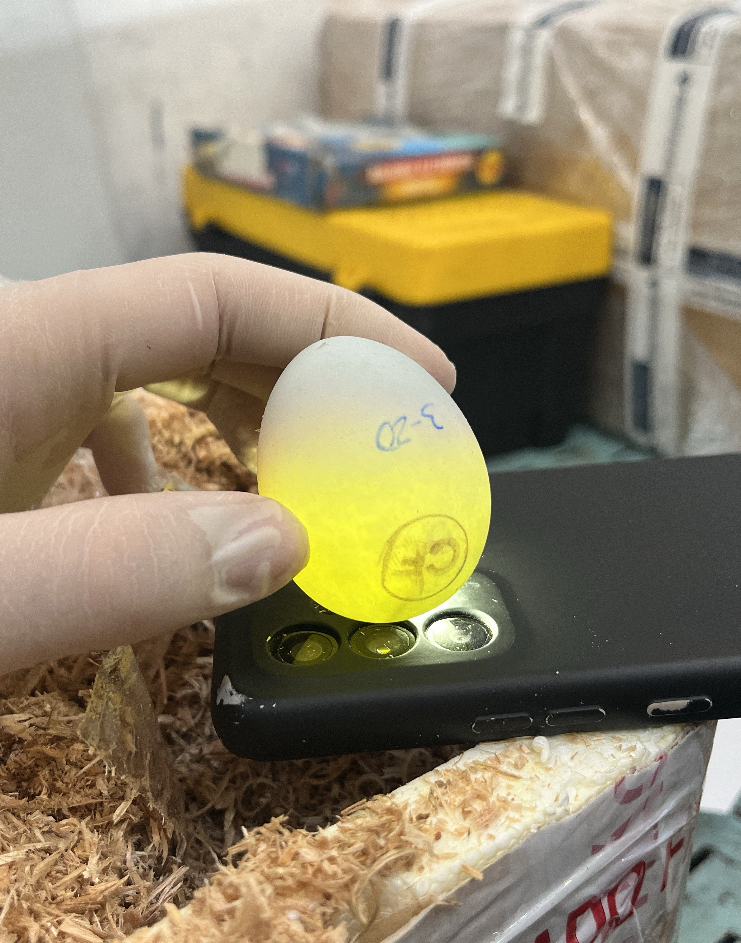 Foto de um ovo sobre a lanterna de um celular