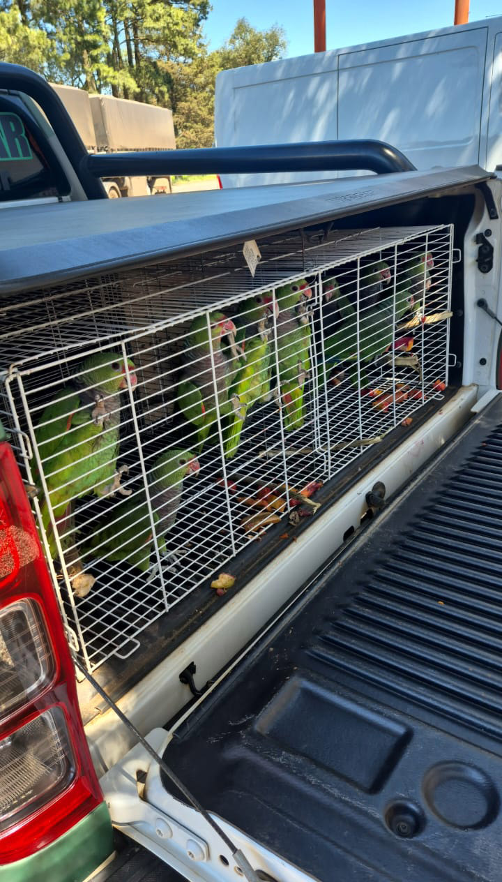 2025-09-26 Papagaios-de-peito-roxo resgatados, em viatura do Ibama.jpg