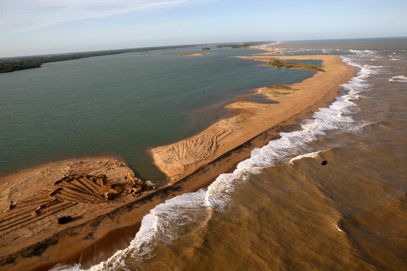 Barreiras de contenção foram colocadas nesta quarta-feira (18) para evitar ou atenuar o possível avanço da lama para áreas de desova. As ações no cordão arenoso da barra do Rio Doce seguem para manter permanentemente abertos os canais escavados que conduzirão a lama diretamente para a praia.