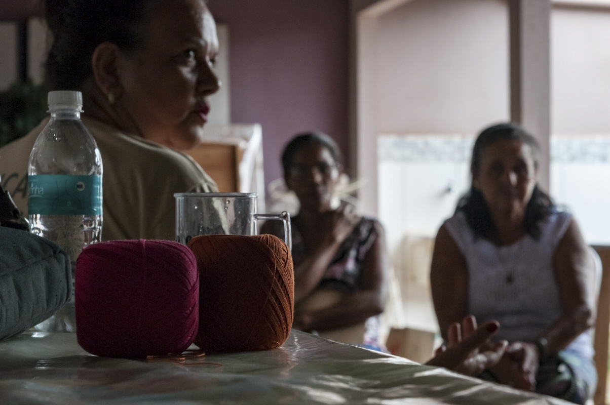 Celene Rorigues, uma das monitoras voluntárias do Projeto Entre Rios, borda desde os 17 anos. Ela conta que quando era adolescente o bordado era obrigatório e a professora, exigente. “Eu, a Aurora, a Ana e a Paula montamos um grupo de bordadeiras lá num bairro carente que se chama Kubstein (na Chapada dos Guimarães - MT). Ficamos três meses e já tínhamos 15 bordadeiras. Saímos de lá porque na frente tinha um bar. Havia umas pessoas que ficavam bêbadas e vinham afrontar as meninas. Nesse meio tempo, duas amigas me disseram ‘Celene, nós temos um grupo aqui no Sol Nascente e esse bairro é tão carente quanto o Kubstein, até mais’. Aí trocamos de bairro, começamos a ensinar bordado toda quinta-feira, das cinco e meia, porque as mães são trabalhadeiras e as meninas vão para a escola, até as oito e meia. Em setembro, eu estava no Rio Grande do Sul e a Paula começou o curso com as Dumond (integrantes da equipe técnica do Projeto Entre Rios). Quando nós entramos aqui (no Projeto), trouxemos todas as nossas alunas”, explica Celene.