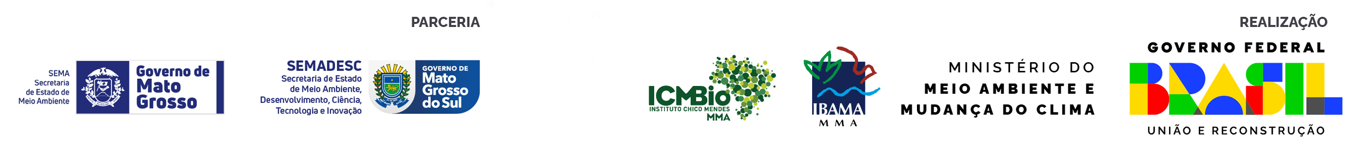 Barra de siglas com as siglas em realização do Governo Federal Brasil: união e reconstrução, Ministério do Meio Ambiente e Mudança do Clima, Ibama, ICMBio e parcerias Governo do estado de Mato Grosso do Sul, Governo do Estado de Mato Grosso e secretarias de meio ambiente.