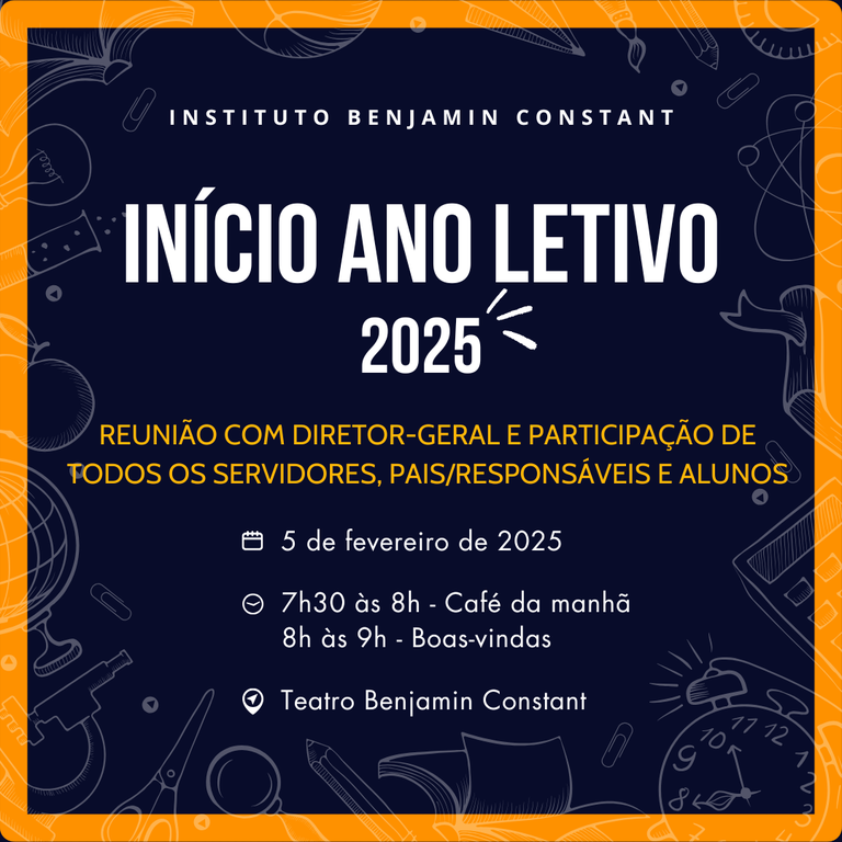 A Direção-Geral do Instituto Benjamin Constant convida todos os servidores, pais/responsáveis e alunos para um encontro de boas-vindas pelo início do ano letivo 2025, no dia 5 de fevereiro, no Teatro Benjamin Constant.