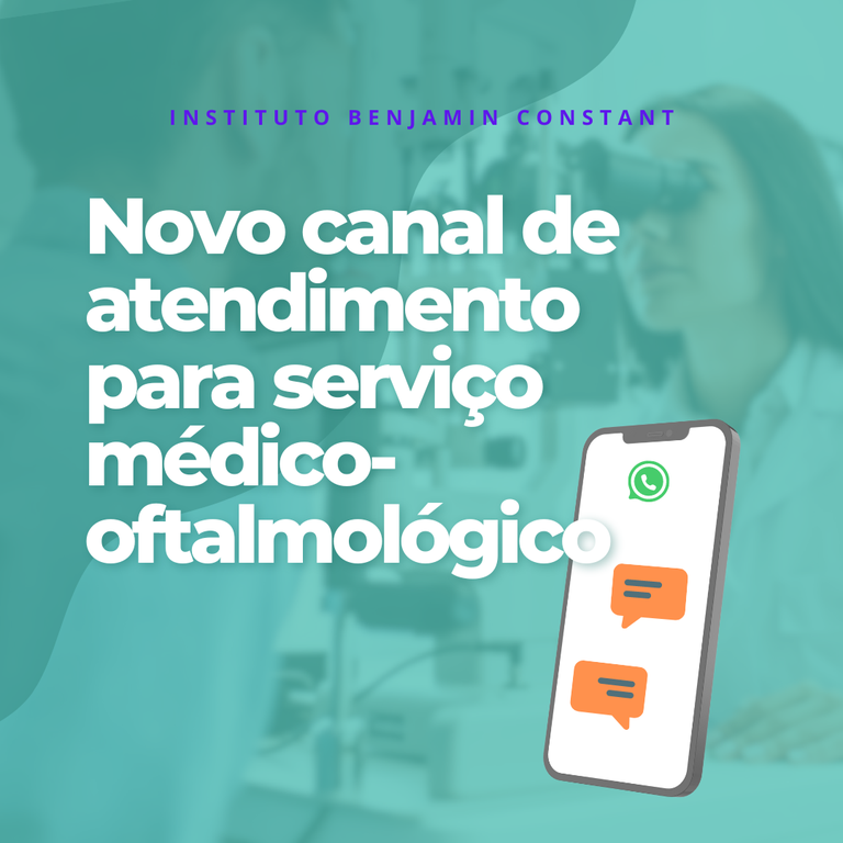 #Audiodescrição: Card com fundo verde sobreposto a foto de médico oftalmologista em atendimento a paciente. Texto: "Instituto Benjamin Constant, Novo canal de atendimento para serviço-médico oftalmológico"