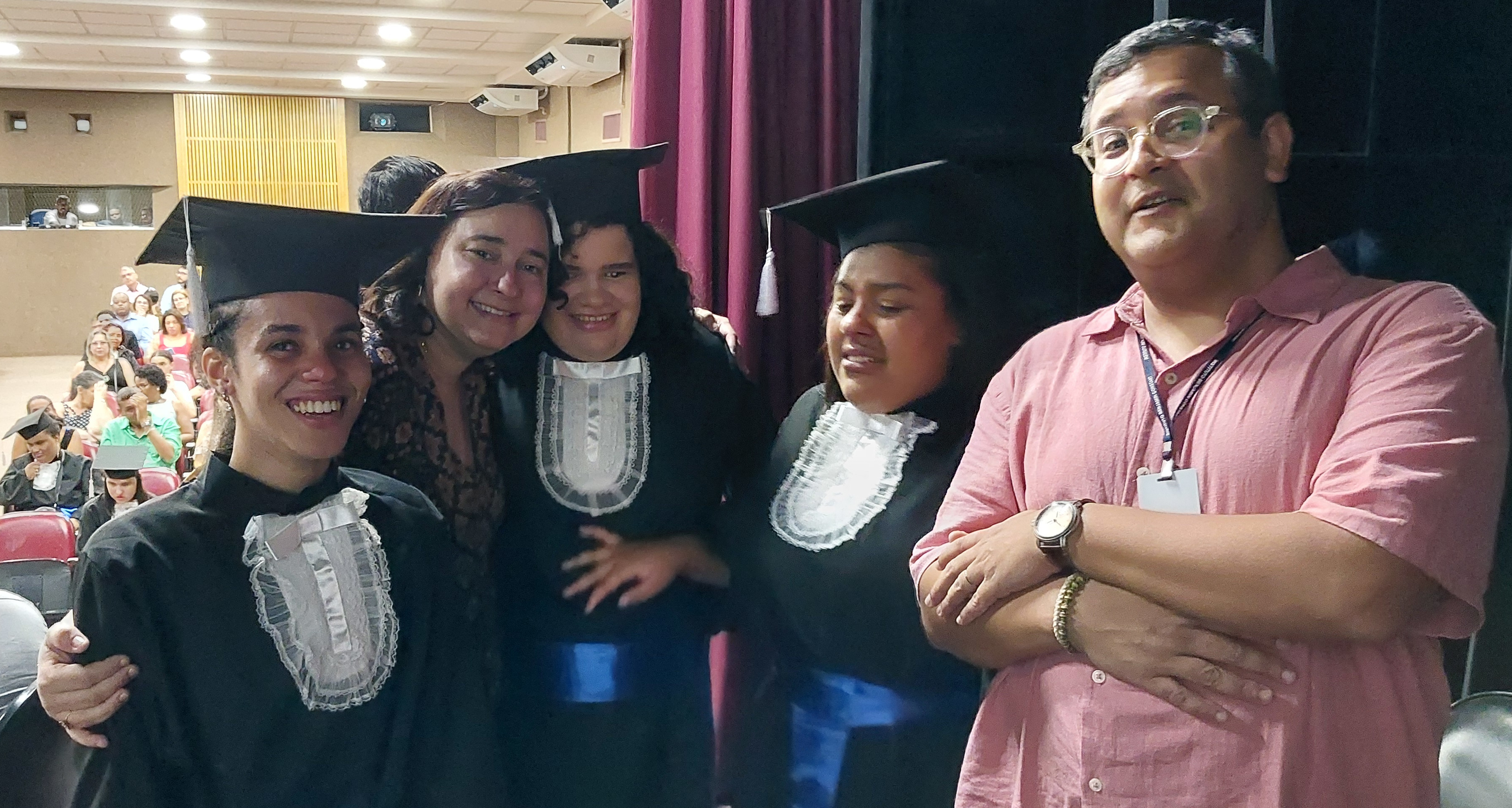 - Na foto a oradora Leila, da turma de Artesanato, a professora Camila, as alunas Julia e Maria e o professor Leonardo.