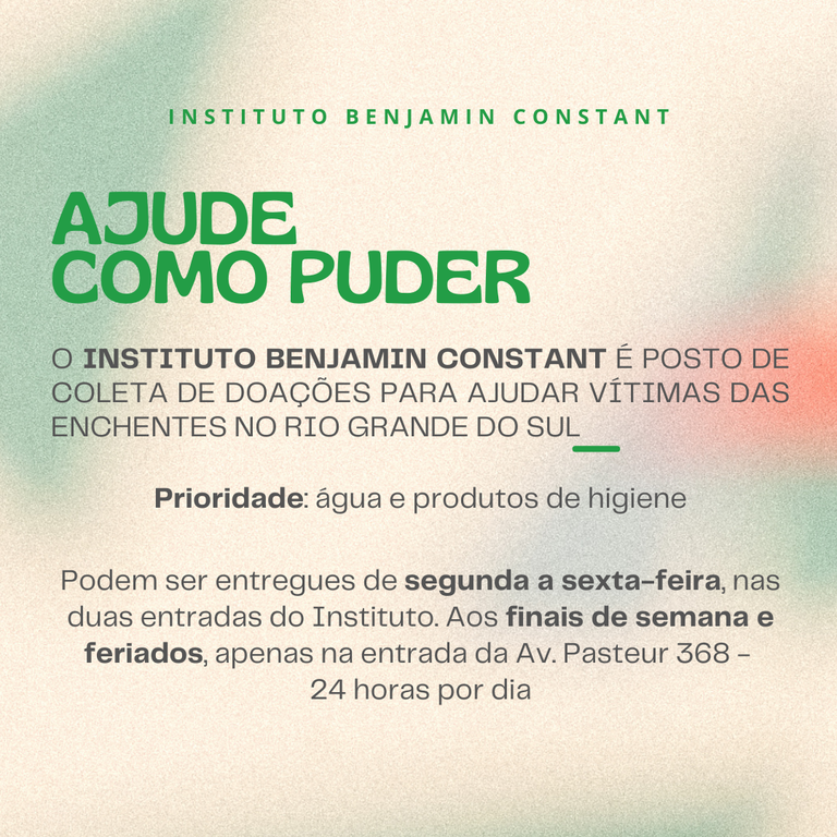 #Audiodescrição: Card fundo em cor verde e bege. Na margem superior central, em letras verde, texto: "Instituto Benjamin Constant". Abaixo, em letras verde e preta, "Ajude como puder, o Instituto Benjamin Constant é posto de coleta de doações para ajudar vítimas das enchentes no Rio Grande do Sul. Prioridade: água e produtos de higiene. Podem ser entregues de segunda a sexta-feira, nas duas entradas do Instituto. Aos finais de semana e feriados, apenas na entrada da Av. Pasteur 368 - 24 horas por dia, www.gov.br/ibc". Na margem inferior as logos do IBC do Ministério da Educação e do Governo Federal. #PraCegoVer #PraTodosVerem