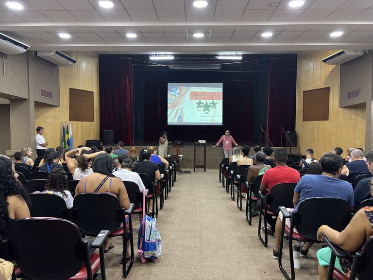 Foto no Teatro Benjamin Constant com fala de boas-vindas da Direção-Geral aos alunos, servidores, pais e responsáveis