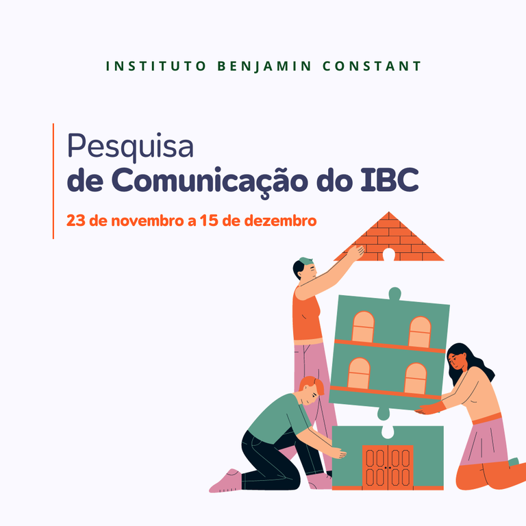 #Audiodescrição: Card fundo cinza claro, letras verdes, azuis e laranja . Na margem superior central, "Instituto Benjamin Constant, Pesquisa da Comunicação do IBC, 23 de novembro a 15 de dezembro". À direita figura de três pessoas trabalhando na construção de um prédio #PraCegoVer #PraTodosVerem